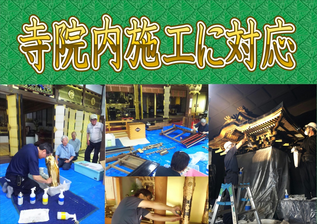 やすらぎ工房は、寺院様の内陣・御本尊の洗浄・修復を全国で施工させて頂いております。出来るだけお安く(漆の磨き直し)から新品同様(塗り直し)まで、ご住職様や御檀家様のご要望をお伺いさせていただきやすらぎ工房の職人がもつ豊富な施工方法で、ご予算面・施工技術面などのお悩みの一助になれば幸いです。