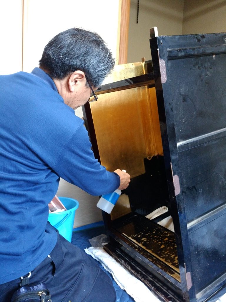 金仏壇の清掃【ご自宅出張洗浄】 公開日: 2017年2月12日 | 投稿者: yasuragiowner やすらぎ工房は[仏壇洗浄修理専門]の職人直営工房です。職人直営価格で仏壇を再生致します。また、移動や廃棄も専門の仏壇洗浄修復師が作業致します。業務【仏壇,仏像,仏具,位牌,寺院】洗浄,修復,クリーニング,補修,掃除,移動,引越し,廃棄,処分。地域(大阪府,京都府,奈良県,兵庫県,滋賀県,和歌山県,三重県) 上記ホームよりホームページを御覧頂き、お気軽にお問い合わせ下さい。 フルサイズ: 768 × 1024ピクセル 金仏壇の洗浄【ご自宅出張クリーニング】 » « 金仏壇のクリーニング【ご自宅出張洗浄】