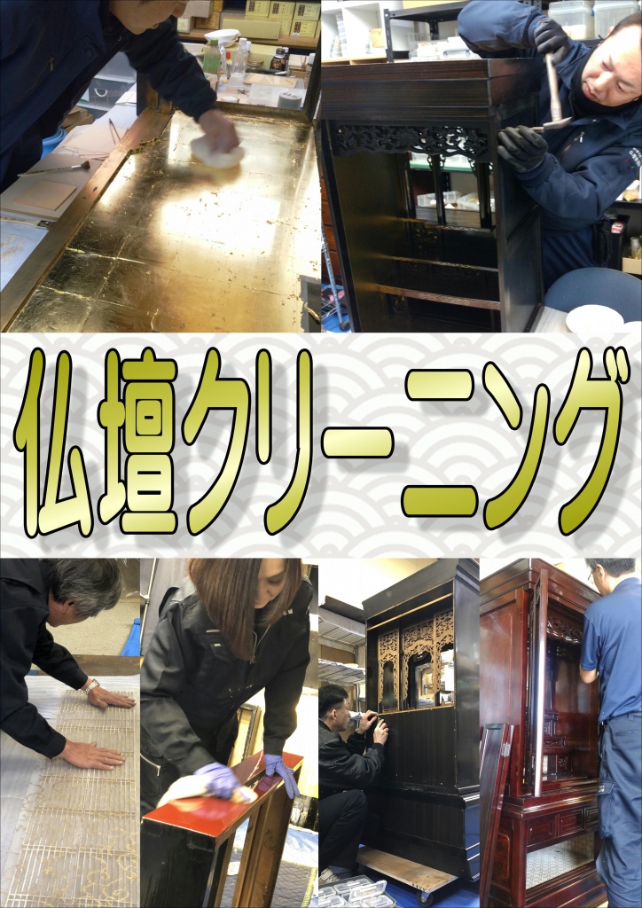 あらかじめご了承ください。 仏壇掃除・修理のメリット 仏壇のお手入れはしっかりされていますか?長年のススや埃、汚れで失われてしまった金箔の輝きをプロの手で取り戻すことができます。買い替えよりも費用を確実に抑えられますし、代々受け継がれてきたものをさらに後世へと残し続けられます。仏壇のお手入れに関しては明確な周期などはありませんが、年忌法要前や退職・還暦のお祝い、新築・増築祝いなどの節目がおすすめです。実家にプレゼントとしてもいいですね。お仏壇再生クリーニングはご自宅でも  施工いたします。お仏壇をご自宅から出したくない方、出すのが困難な場所など、出張で施工いたします。障子 (紗) の張替えです。永年のススやホコリで汚れたり、破れたりしています。紗を張り替えるだけでも、見違えるように綺麗になります。紗張替えだけの部分修復も承ります。造り付けのお仏壇の修復です。正面、側面に金紙を貼り、洗浄、艶出しを施しました。唐木仏壇の再生クリーニングです。唐木専用洗剤で汚れを落とし、正面、側面の金紙を張り替えます。その後、艶出し、紗の貼り替えです。お仏壇クリーニング (洗浄・修復)木地の大きな傷みもなく、お線香のススやホコリで汚れているだけなら、クリーニングできれいにに再生できます。