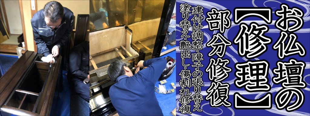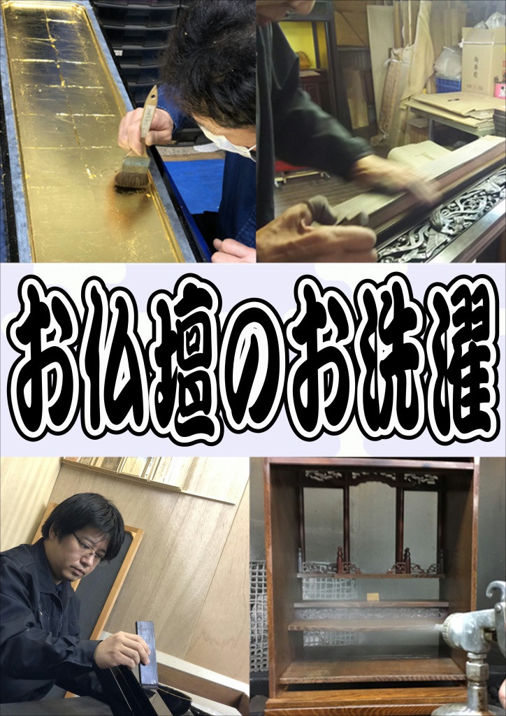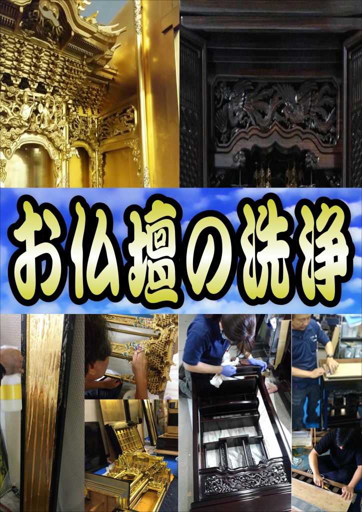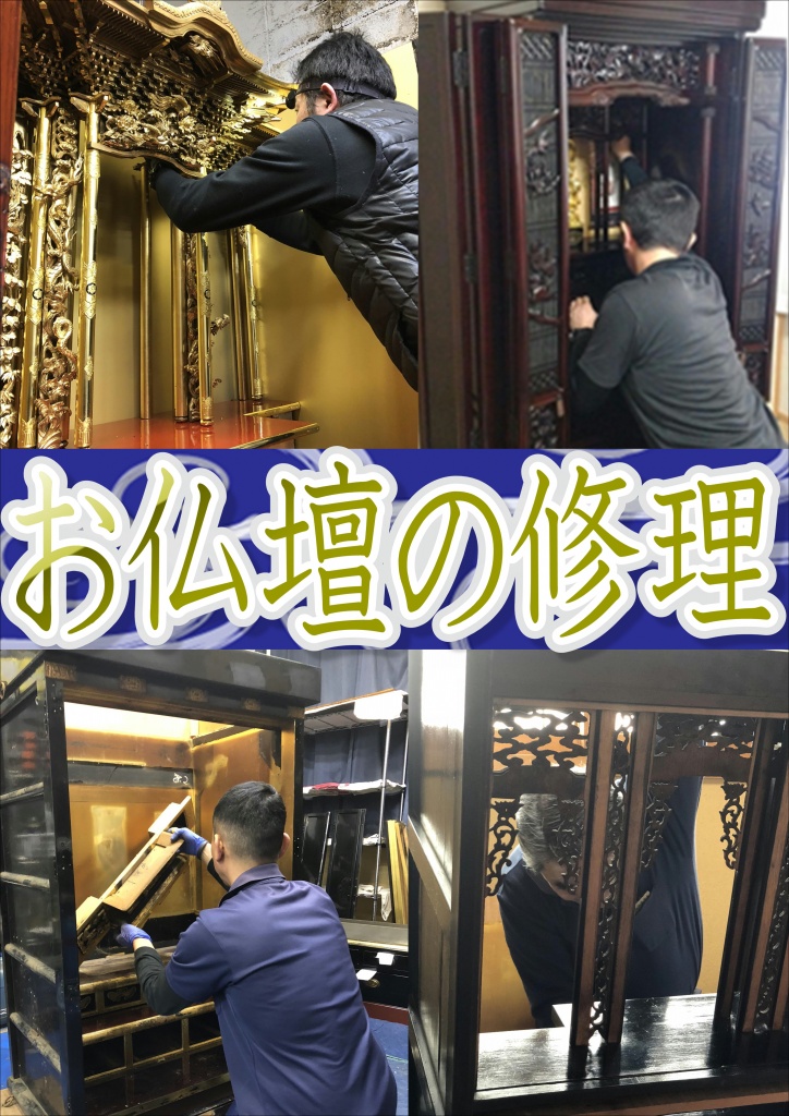 【完全見積り無料】お仏壇のお掃除から部分修理や洗浄・クリーニング、洗いお洗濯(完全修復)まで、すべての作業に対応しております。また、お仏壇のお引越しや移動移設(保管)お仏壇の廃棄処分も職人直営価格にてさせて頂いております。