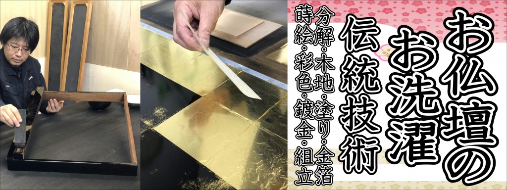 【仏壇預かり 奈良】仏壇預かりの際、お仏壇の障子の紗(しゃ)の部分も時が経つと変色したり、破れたりします。障子の磨きとともに紗も新品に張り替えます。漆部分磨き・金箔部分洗浄 金箔洗浄、金箔お掃除、金箔洗い、漆塗り、漆洗浄、漆磨きお仏壇に合わせて本体部分の洗浄はもちろん、研磨剤・洗剤を用いて漆部分を 磨きます。線香・ローソクの煤や油煙などの汚れを取り除き、本来の輝きを 取り戻します。痛みのひどい場合、傷が多い場合は修復や塗り直しをします。金箔部分は泡洗浄で汚れを落とします。